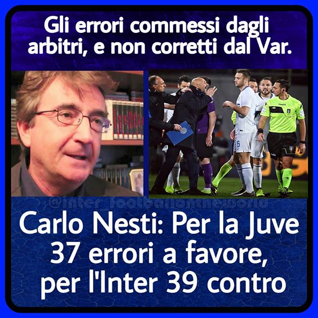 LA CLASSIFICA DEGLI ERRORI – Ecco pertanto, secondo Nesti, dopo 32 giornate di campionato, la situazione delle “8 grandi” della Serie A. Errori a favore: Juventus 37, Fiorentina 30, Inter 25, Roma 22, Lazio e Milan 21, Torino 16 e Napoli 14. Errori contro: Torino 44, Inter 39, Milan 38, Juventus 23, Napoli 22, Roma 19, Fiorentina 16 e Lazio 15. Il conteggio tiene in considerazione gli errori commessi, a proposito di gol, rigori, fuorigioco, espulsioni e punizioni.