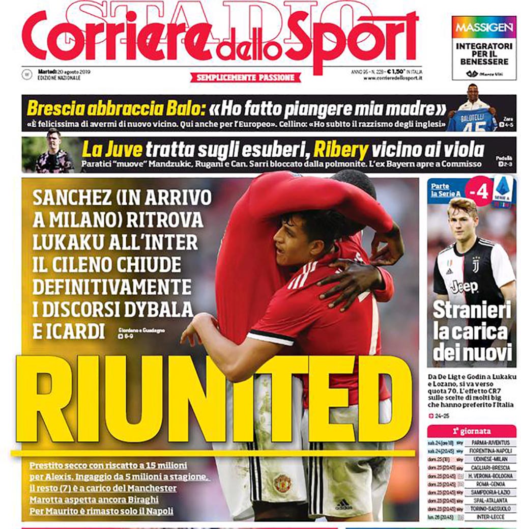 “RiUnited“. Il Corriere dello Sport apre così l’edizione di martedì 20 agosto con la notizia dell’arrivo di Sanchez dal Manchester United all’Inter. Sanchez ritrova Lukaku all’inter. Il cileno chiude definitivamente i discorsi Dybala e Icardi?