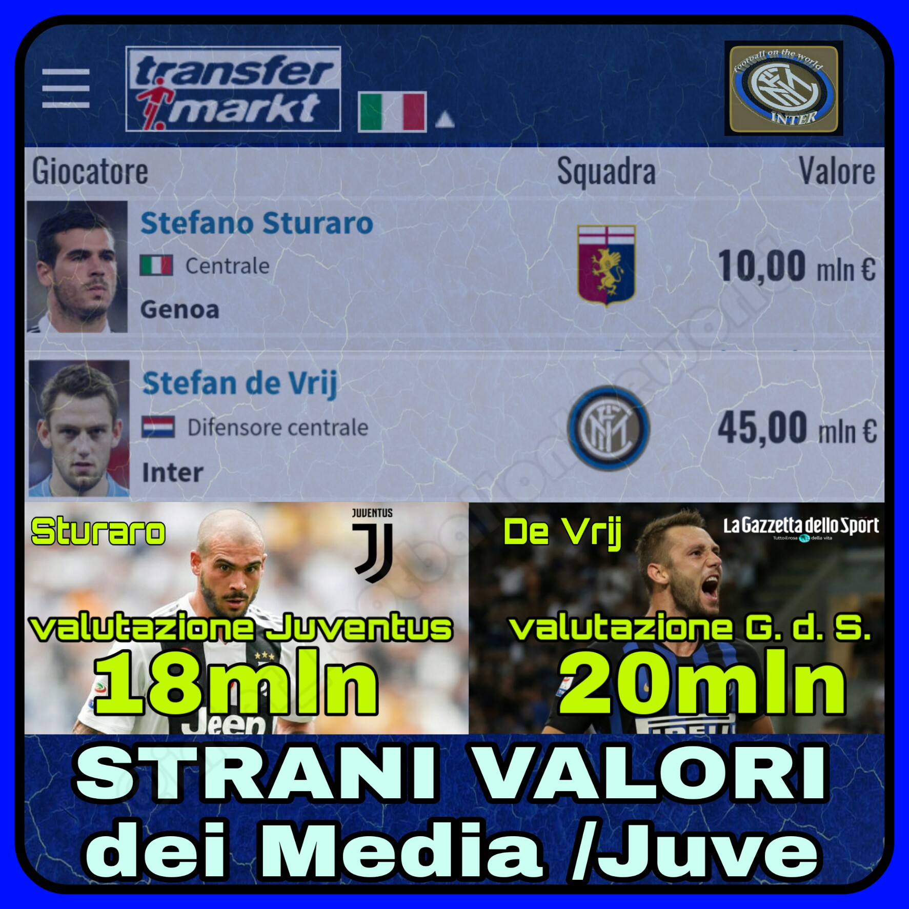 De Vrij è una delle poche stelle dell’Inter perché sarebbe titolarissimo in tutte le squadre italiane e in molti top club esteri, ma forse a qualcuno questa cosa non piace. Il colpo a zero fatto un anno fa non è stato digerito, mediaticamente le valutazioni fatte per e dalla Juventus sono ben diverse, Sturaro insegna