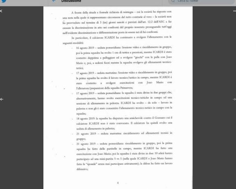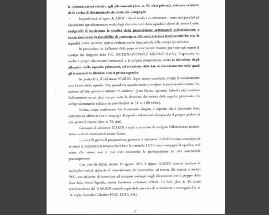 “Ora è davvero guerra. Icardi, infatti, ha fatto causa all’Inter: chiede il reintegro nella parte tecnico-tattica degli allenamenti e, in aggiunta, per la condotta discriminatoria subìta, un risarcimento danni di 1,5 milioni di euro, ovvero il 20% del suo ingaggio lordo. La particolarità di tale richiesta, però, è che non è stata fatta a mercato concluso, ma proprio a pochi giorni dalla scadenza. Che significa? Beh, tenuto conto che il procedimento decadrebbe in caso di passaggio ad un’altra squadra, c’è il sospetto che dietro ci sia una strategia per forzare la mano al club nerazzurro e ottenere il trasferimento nella squadra preferita. Ovvero la Juventus, per di più con la formula del prestito. Solo che l’Inter, secondo quanto emerso giovedì, oltre al rinnovo del contratto, per il prestito appunto, aveva posto come condizione anche la destinazione estera“.