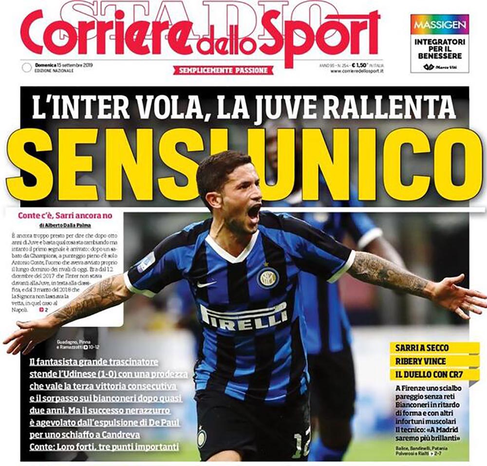 Sensi unico: l’Inter vola, la Juve rallenta“. Così il Corriere dello Sport apre nella prima pagina dell’edizione odierna. “Il fantasista grande trascinatore stende l’Udinese (1-0) – si legge – con una prodezza che vale la terza vittoria consecutiva e il sorpasso sui bianconeri dopo quasi due anni. Ma il successo nerazzurro è agevolato dall’espulsione di De Paul per uno schiaffo a Candreva. Conte: “Loro forti, tre punti importanti”. In bianco la prima di Icardi, alle magie ci pensa Neymar:Maurito entra dalla panchina con lo Strasburgo, il Psg salvato da una rovesciata del brasiliano”.