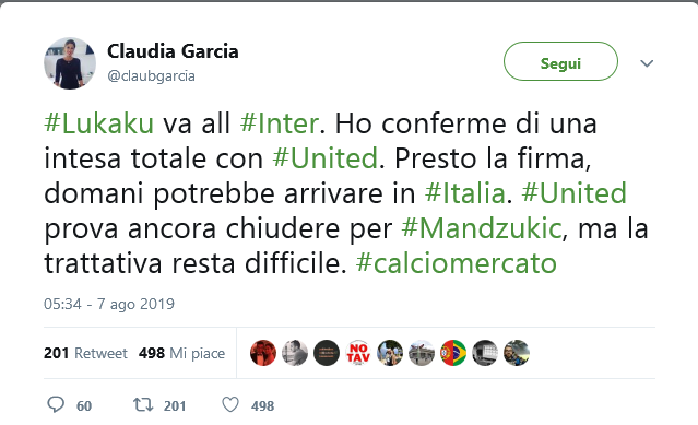 “La Juventus, nel frattempo, sta perfezionando la cessione di Mandzukic proprio allo United: un affare slegato dall’operazione Lukaku, e che potrebbe paradossalmente tramutarsi in un assist per l’Inter, dando agli inglesi il sostituto del centravanti belga e a Marotta il tempo per la sua trattativa“.