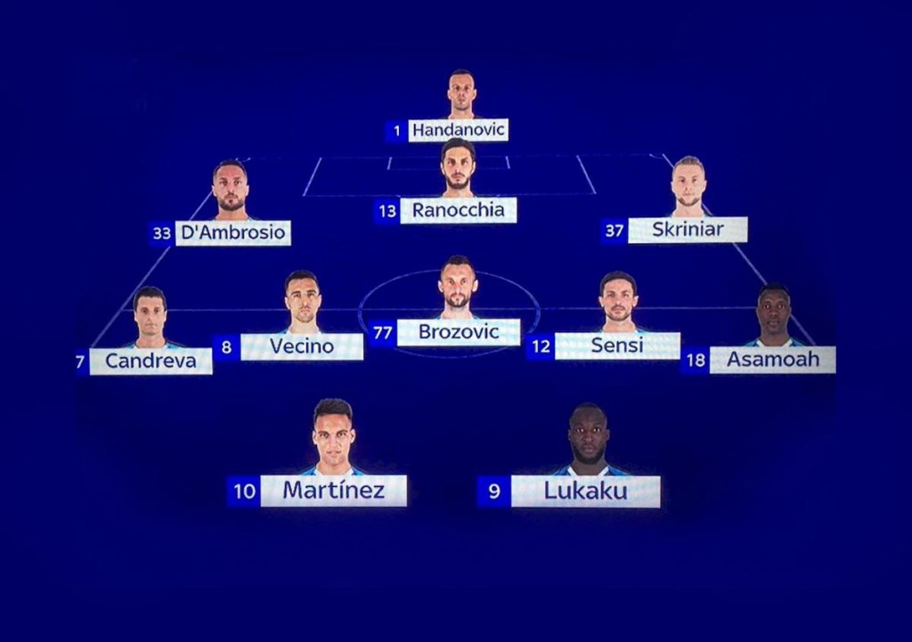 Per la prima stagionale, questa dovrebbe essere la formazione che scenderà in campo: Handanovic; D’Ambrosio, De Vrij, Skriniar; Candreva, Sensi, Brozovic, Vecino, Asamoah; Lautaro, Lukaku.