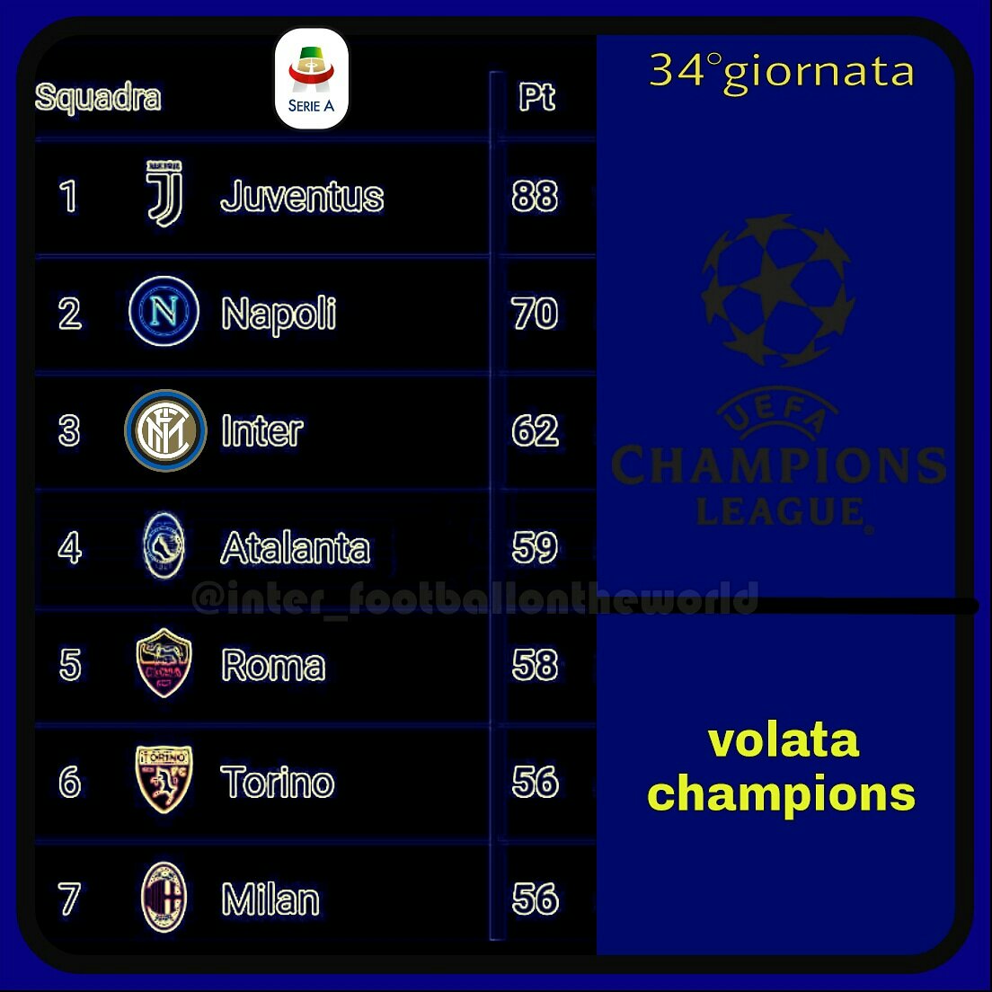 L’Inter va in Champions League se: vince con l’Empoli. Se pareggia e il Milan non vince. Se perde e il Milan non vince (in questo caso l’Inter rischierebbe se la Roma dovesse vincere e l’Atalanta perdere. In una situazione del genere solo il pareggio del Milan permetterebbe ai nerazzurri di qualificarsi in Champions per i maggior punti nella classifica avulsa)